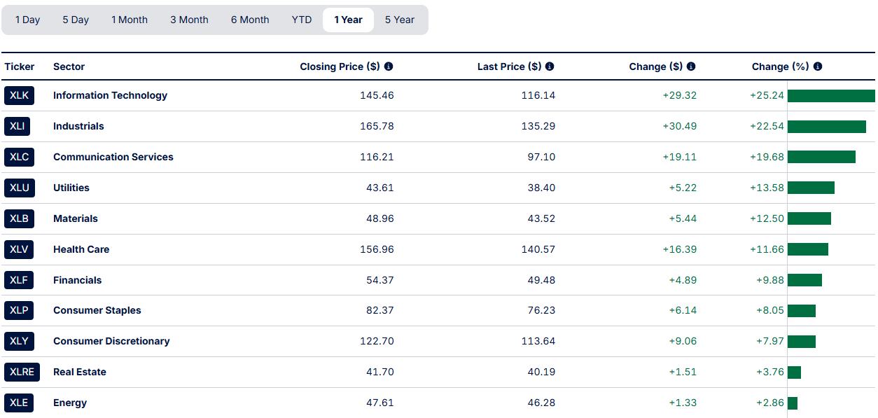 | XLC | Communication Services | 1,100.05 | 9.93% |